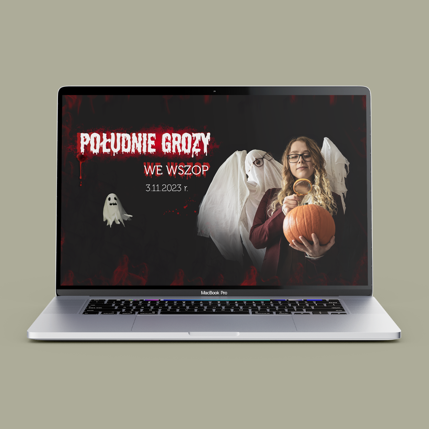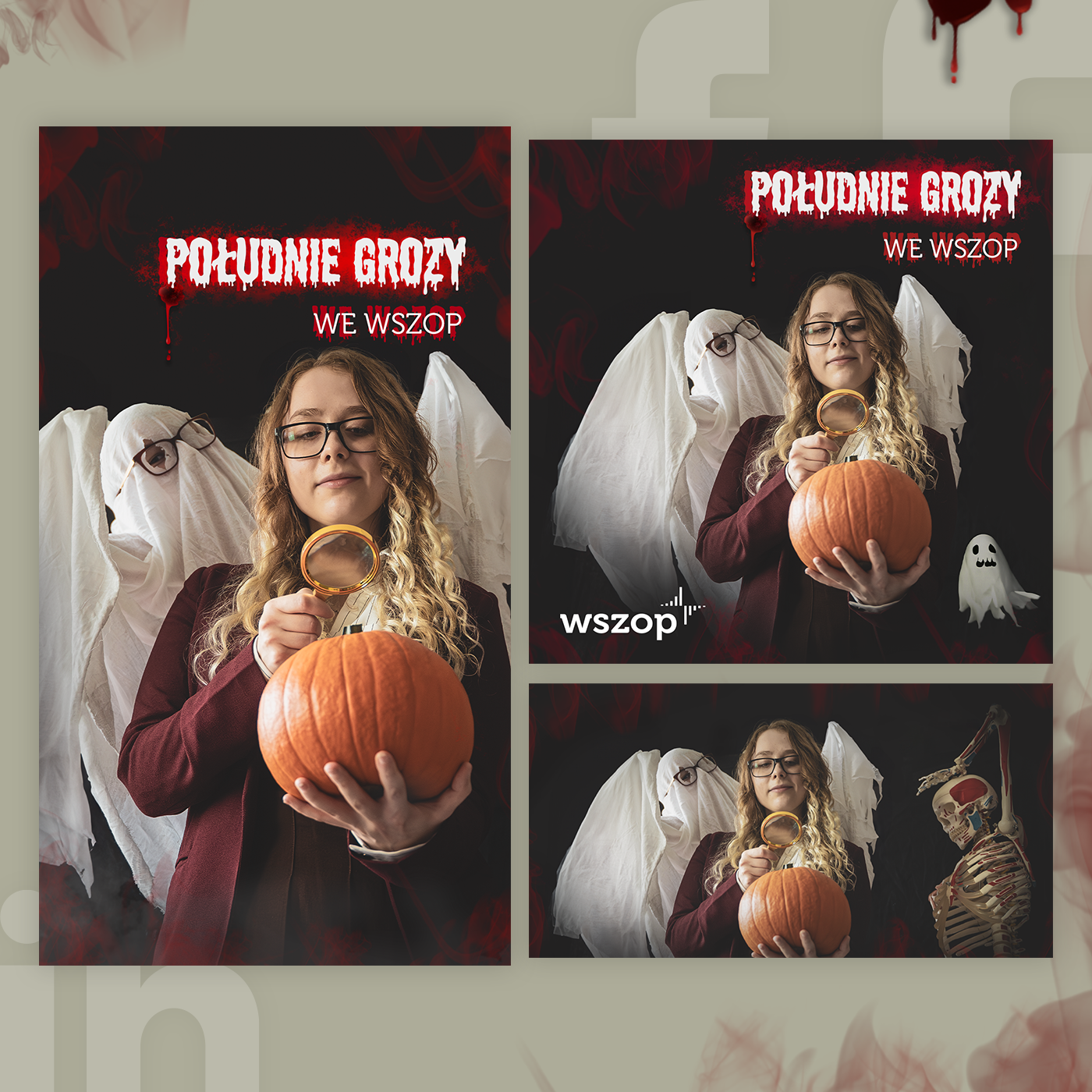 A special photo shoot was organised for the event, in which members of the Forensic and Criminology Science Club and a skeleton took part. Julia Grudzień was responsible for the photo shoot and retouching of the photos. My task was to design a poster (B2 format), graphics for social media posts, a thumbnail and the end screen for the YouTube video, a presentation template, a banner for the newsletter and graphics for the slider on the university's website. In the work, we also used elements generated by artificial intelligence (the Generative Fill function in Adobe Photoshop).
